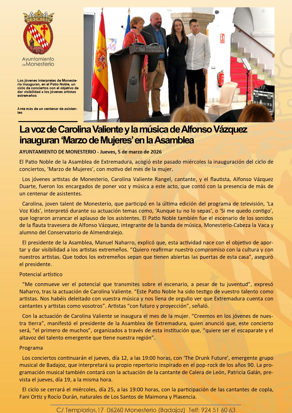 La voz de Carolina Valiente y la música de Alfonso Vázquez inauguran ‘Marzo de Mujeres’ en la Asamblea