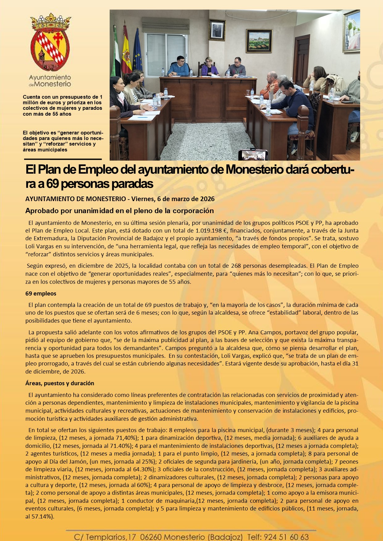El Plan de Empleo del ayuntamiento de Monesterio dará cobertura a 69 personas paradas