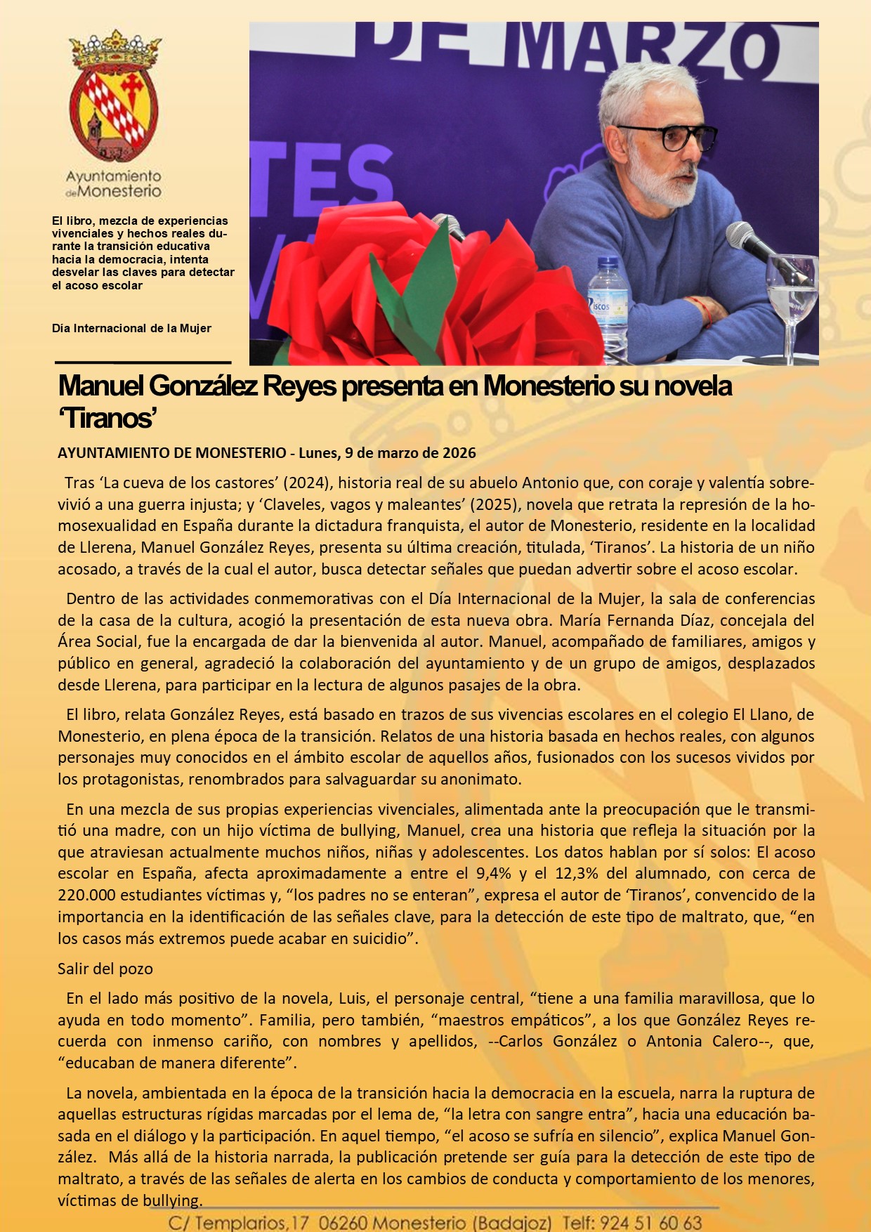 Manuel González Reyes presenta en Monesterio su novela ‘Tiranos’