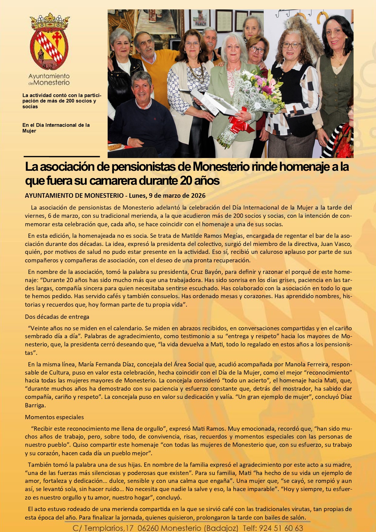 La asociación de pensionistas de Monesterio rinde homenaje a la que fuera su camarera durante 20 años