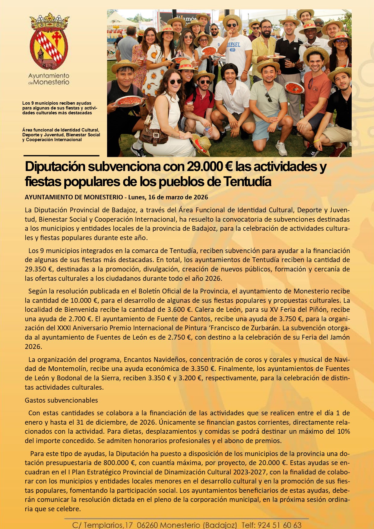 Diputación subvenciona con 29.000 € las actividades y fiestas populares de los pueblos de Tentudía