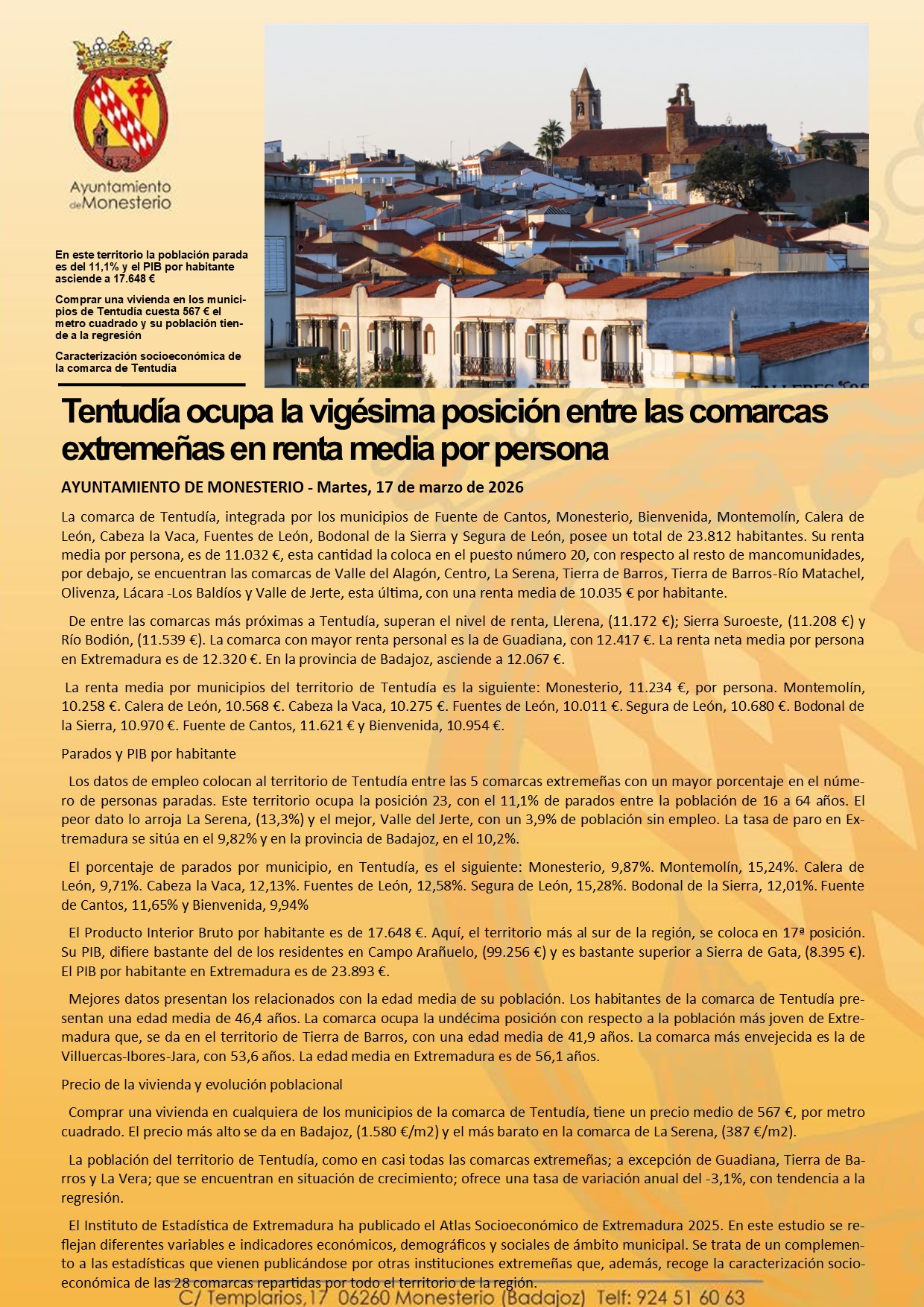 Tentudía ocupa la vigésima posición entre las comarcas extremeñas en renta media por persona