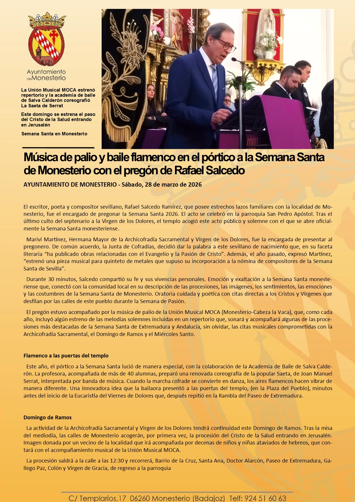 Música de palio y baile flamenco en el pórtico a la Semana Santa de Monesterio con el pregón de Rafael Salcedo