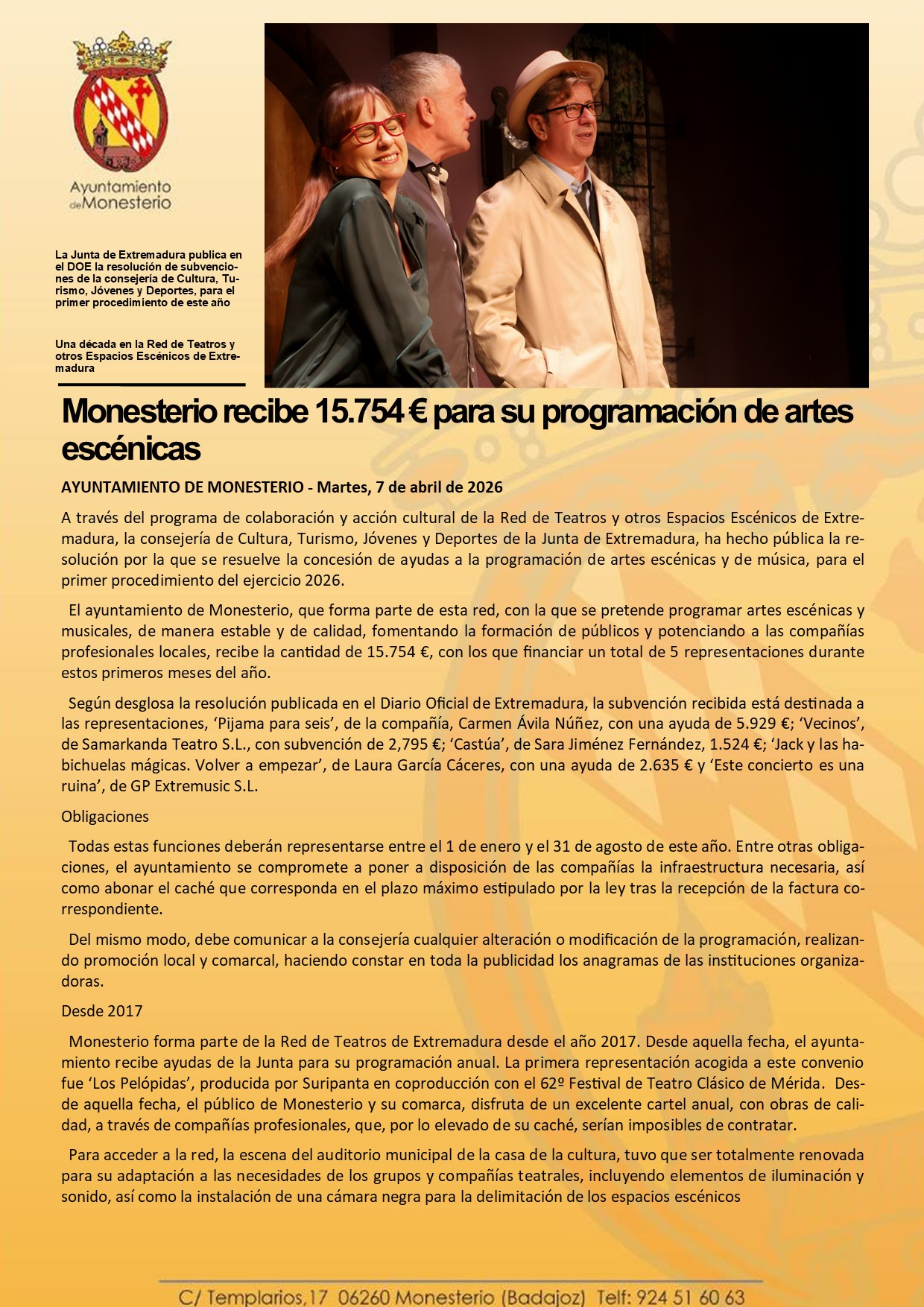 Monesterio recibe 15.754 € para su programación de artes escénicas