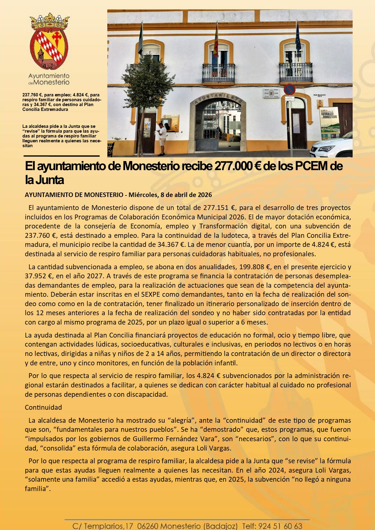 El ayuntamiento de Monesterio recibe 277.000 € de los PCEM de la Junta