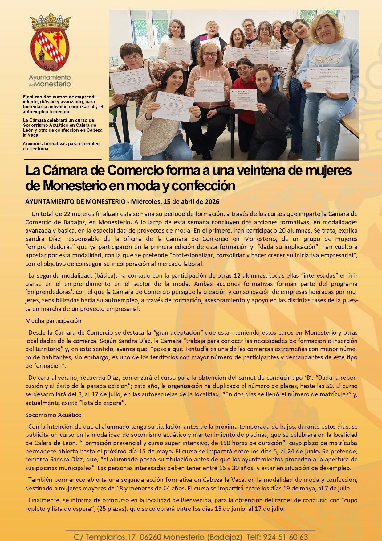 La Cámara de Comercio forma a una veintena de mujeres de Monesterio en moda y confección