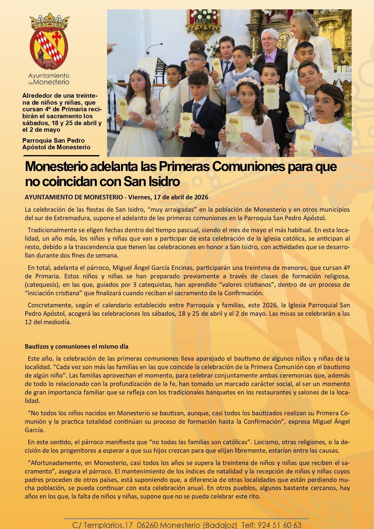 Monesterio adelanta las Primeras Comuniones para que no coincidan con San Isidro