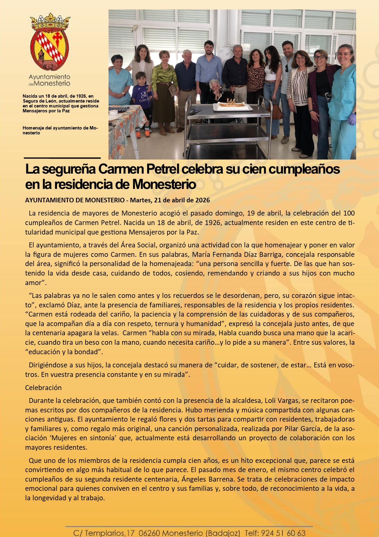 La segureña Carmen Petrel celebra su cien cumpleaños en la residencia de Monesterio