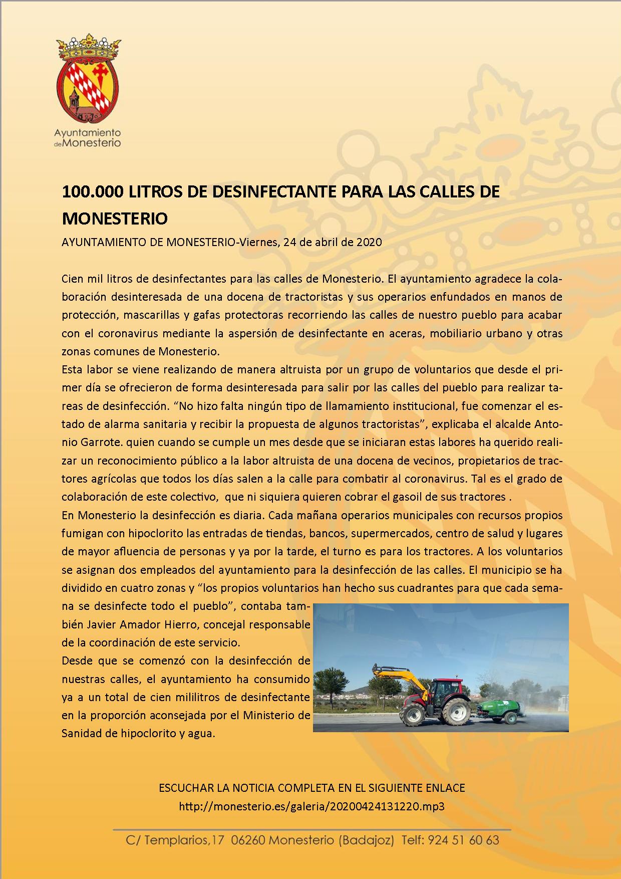 RADIO MONESTERIO - 100.000 litros de desinfectante para las calles de Monesterio