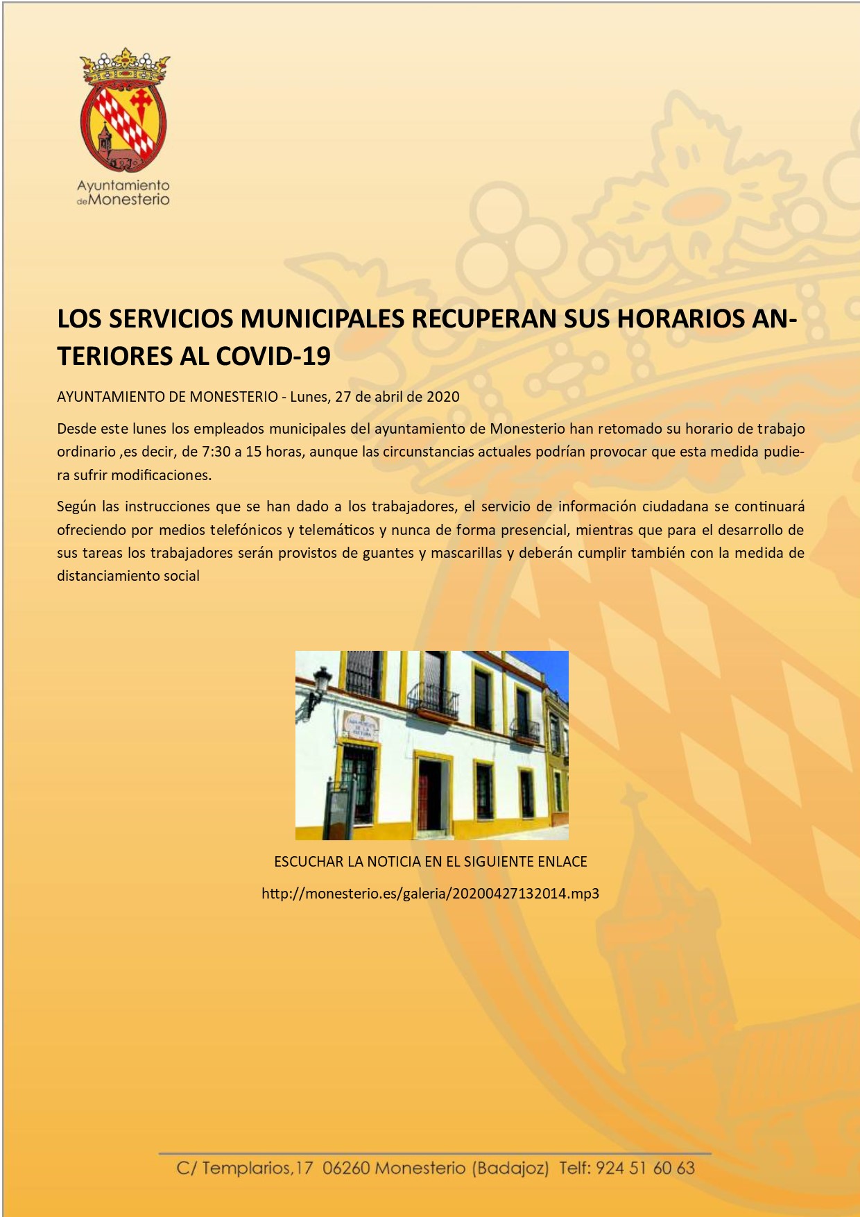 RADIO MONESTERIO - Los servicios municipales recuperan sus horarios anteriores al covid-19
