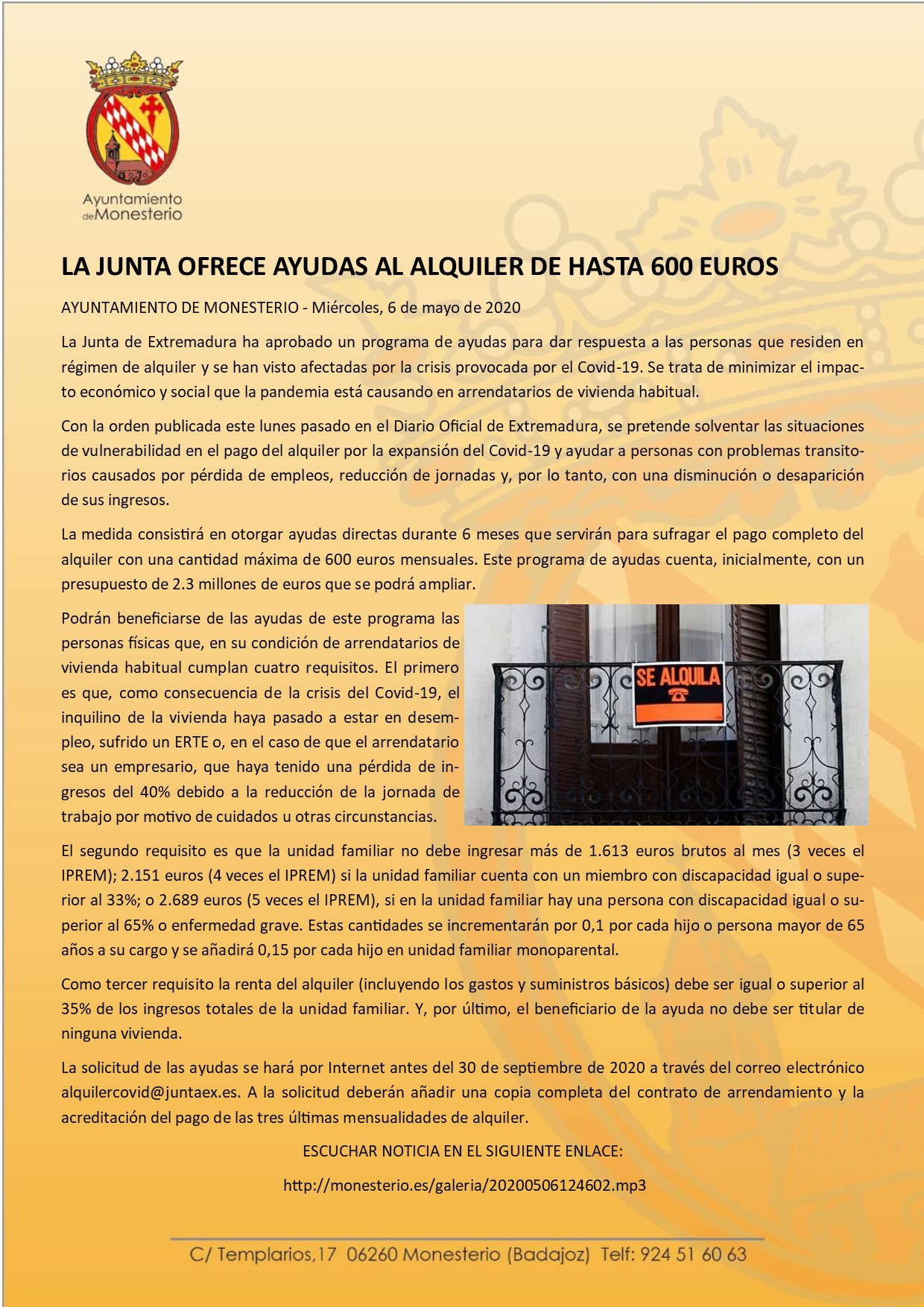 RADIO MONESTERIO - La Junta ofrece ayudas al alquiler de hasta 600 euros