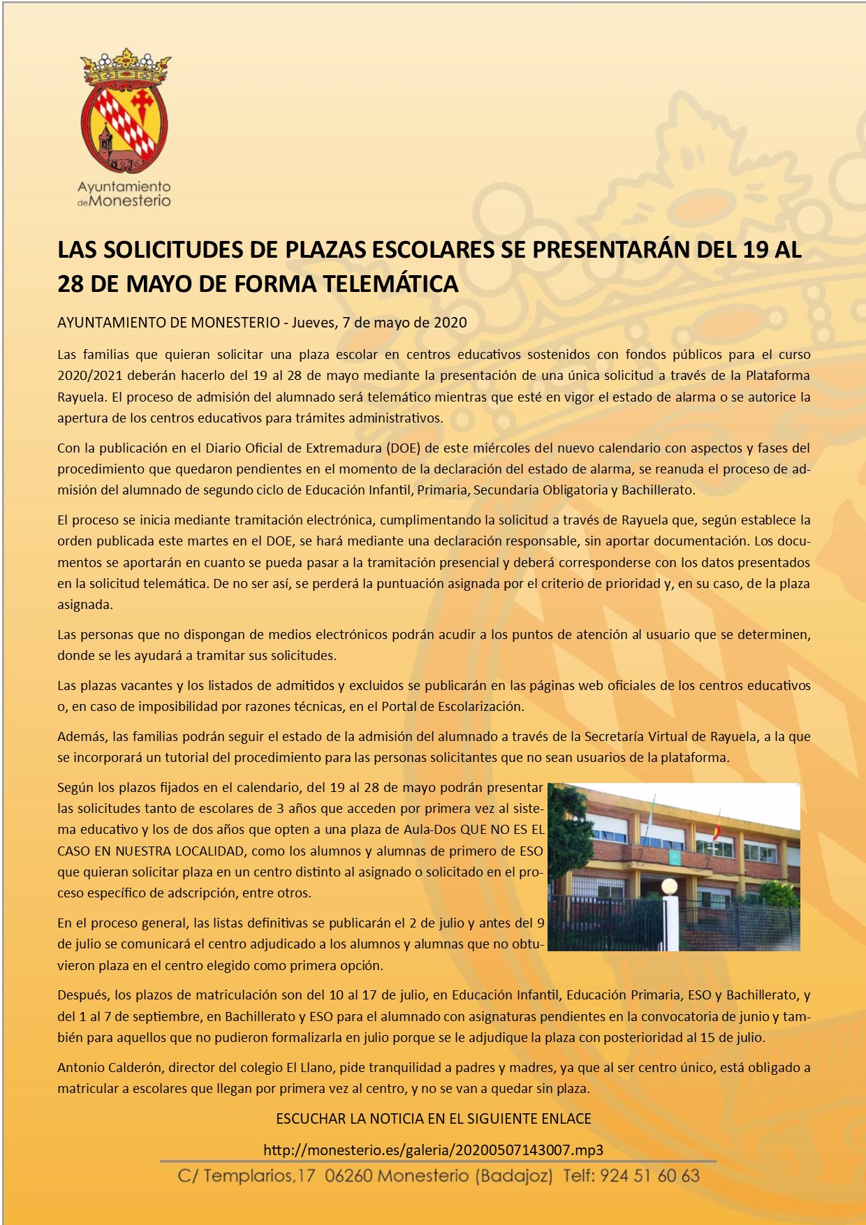 RADIO MONESTERIO - Las solicitudes de plazas escolares se presentarán del 19 al 28 de mayo de forma telemática