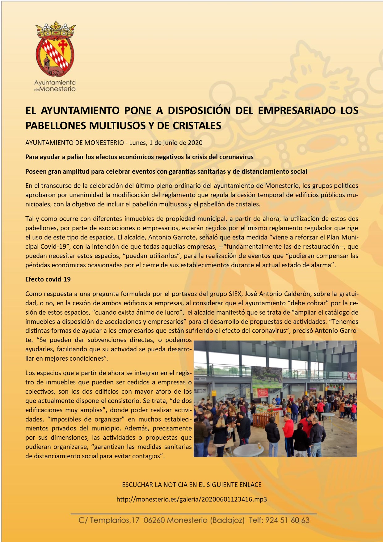 RADIO MONESTERIO - El ayuntamiento de Monesterio pone a disposición de los empresarios los pabellones multiusos y de cristales