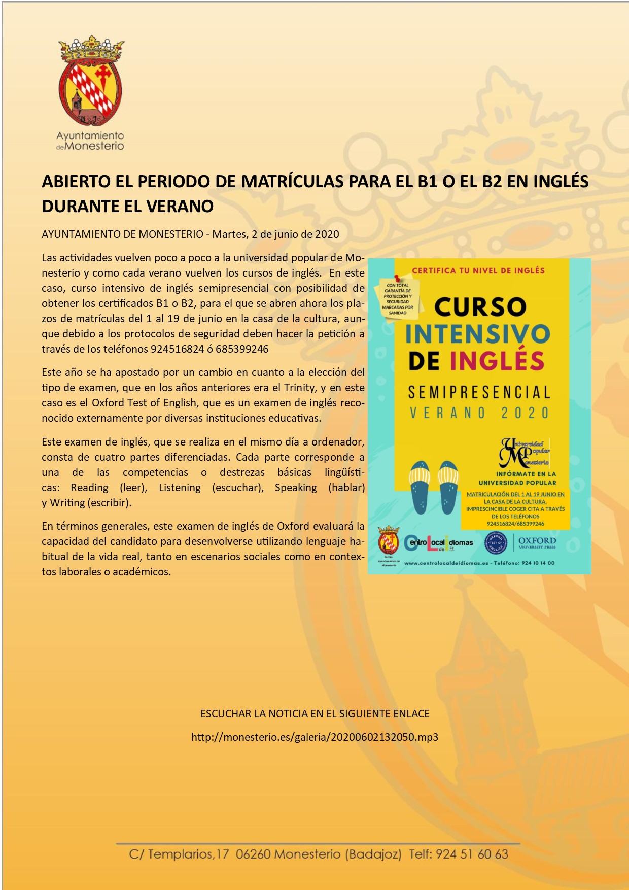 RADIO MONESTERIO - Abierto el periodo de matrículas para el B1 o el B2 en Inglés durante el verano