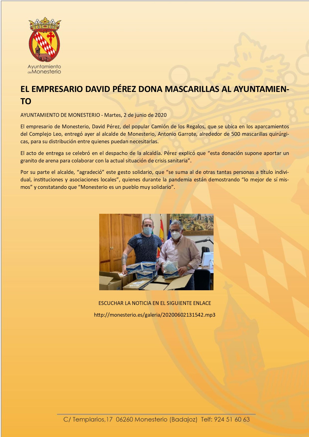 RADIO MONESTERIO - El empresario David Pérez dona mascarillas al ayuntamiento