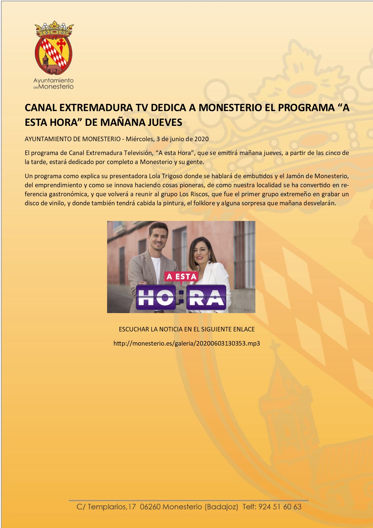 RADIO MONESTERIO - Canal Extremadura TV dedica a Monesterio el programa A esta Hora, de mañana jueves