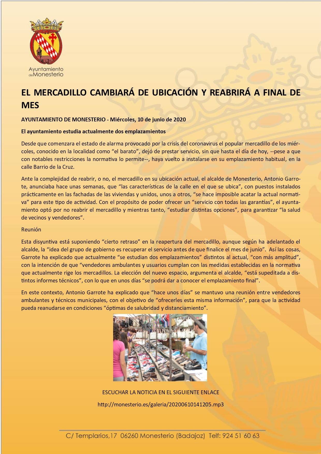 RADIO MONESTERIO - El mercadillo cambiará de ubicación y reabrirá a final de mes