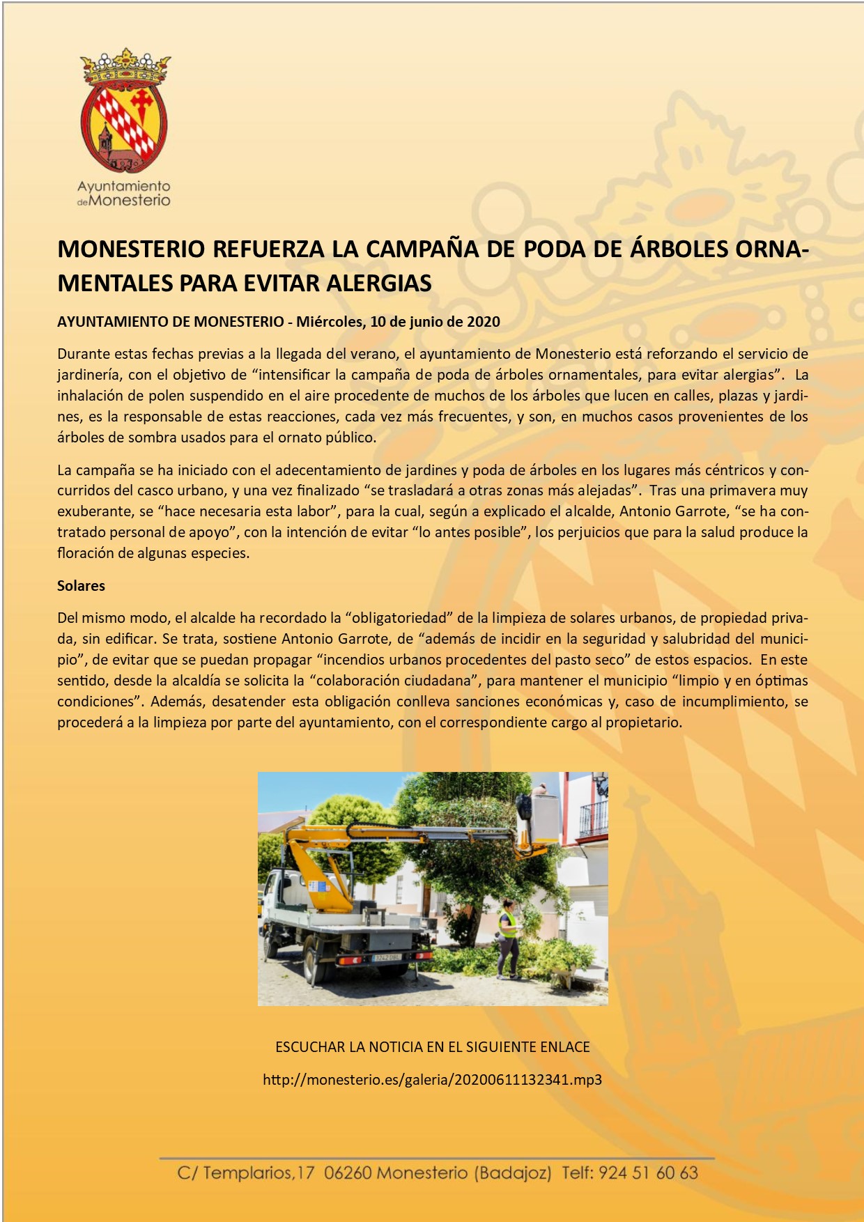 Monesterio refuerza la campaña de poda de árboles ornamentales para evitar alergias