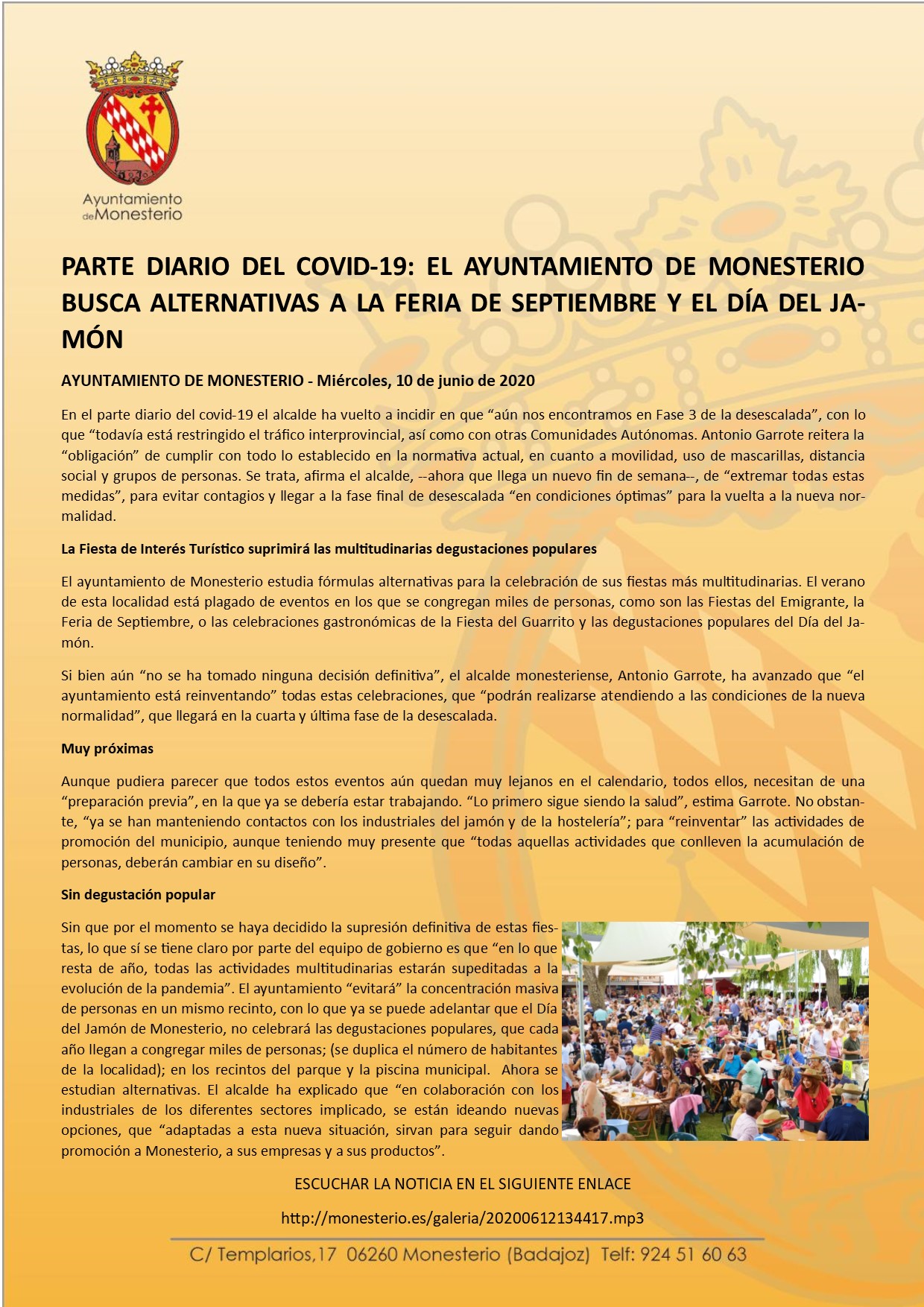 Parte diario del Covid-19: EL AYUNTAMIENTO DE MONESTERIO BUSCA ALTERNATIVAS A LA FERIA DE SEPTIEMBRE Y EL DÍA DEL JAMÓN