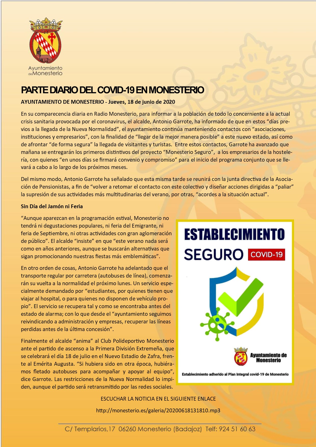 Parte diario del Covid-19 en Monesterio