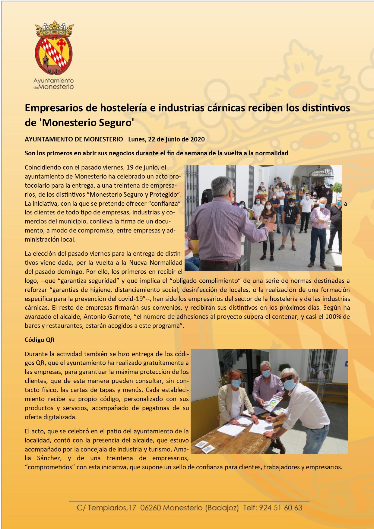Empresarios de hostelería e industrias cárnicas reciben los distintivos de 'Monesterio Seguro'
