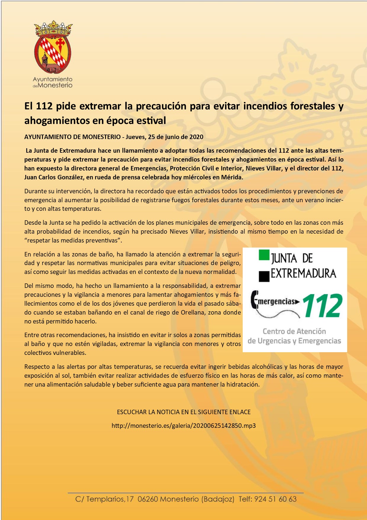 El 112 pide extremar la precaución para evitar incendios forestales y ahogamientos en época estival