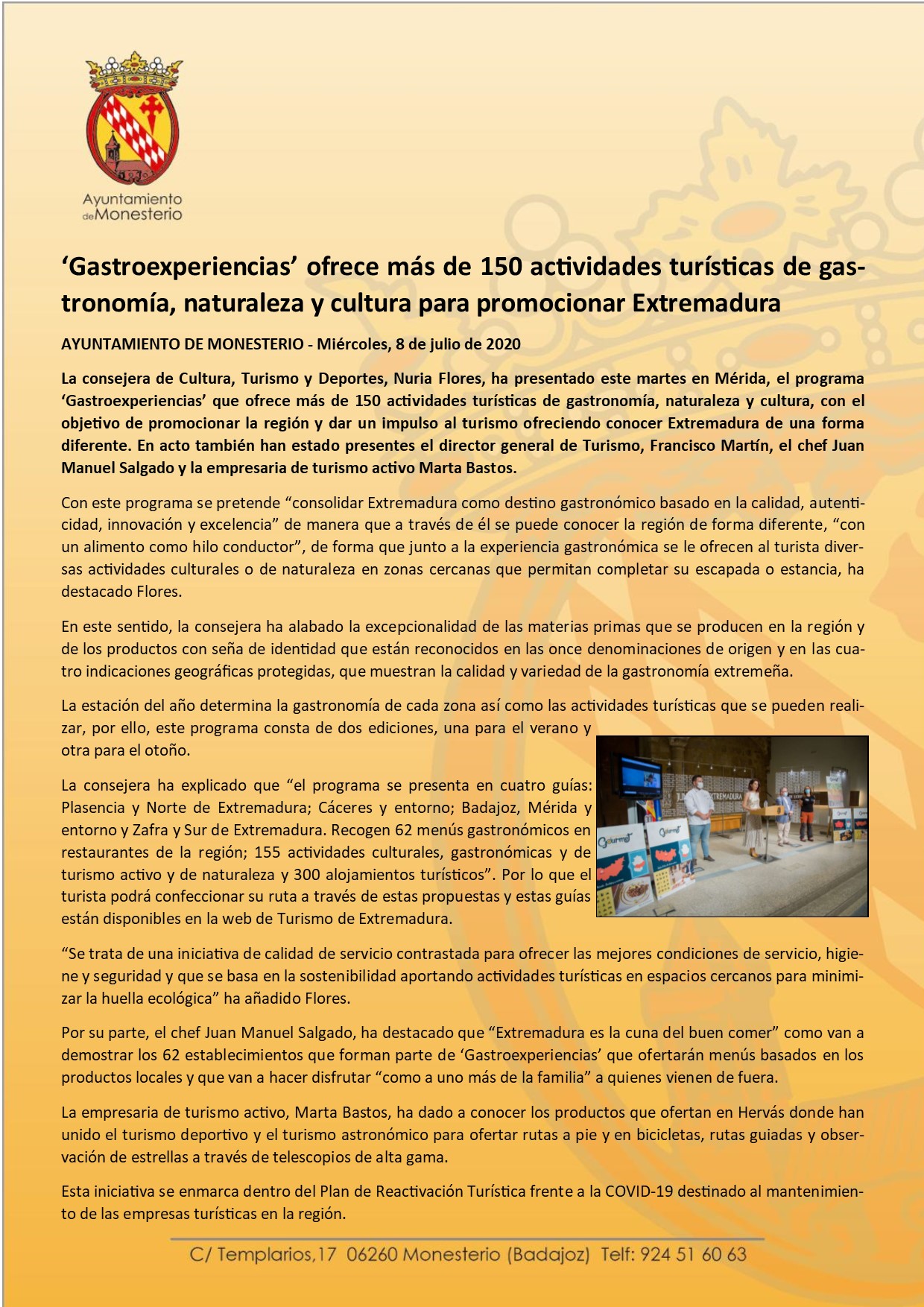 La consejera de Cultura, Turismo y Deportes, Nuria Flores, ha presentado este martes en Mérida, el programa ‘Gastroexperiencias’ que ofrece más de 150 actividades turísticas de gastronomía, naturaleza y cultura, con el objetivo de promocionar la región y dar un impulso al turismo ofreciendo conocer Extremadura de una forma diferente. En acto también han estado presentes el director general de Turismo, Francisco Martín, el chef Juan Manuel Salgado y la empresaria de turismo activo Marta Bastos.