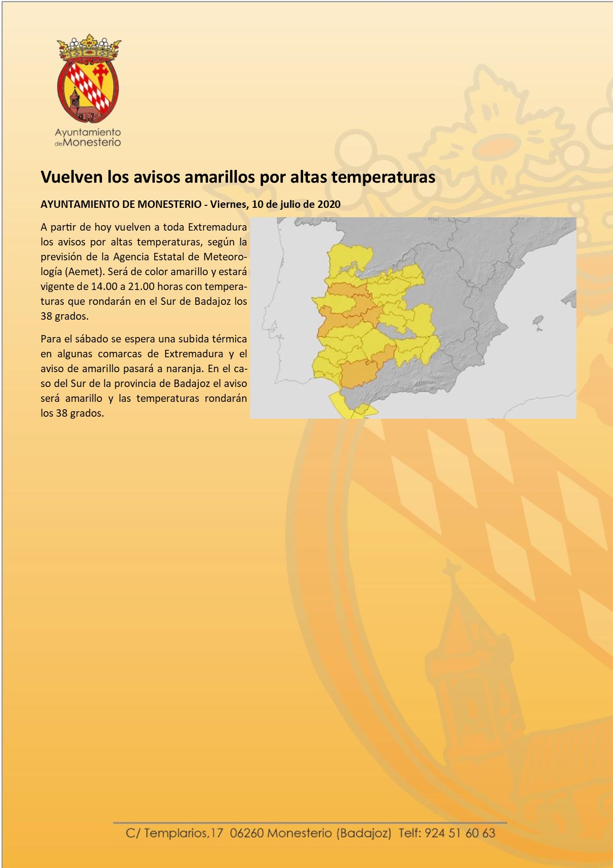Vuelven al Monesterio los avisos amarillos por altas temperaturas