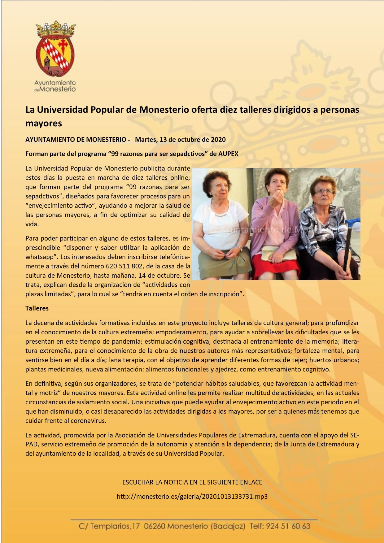 La Universidad Popular de Monesterio oferta diez talleres dirigidos a personas mayores