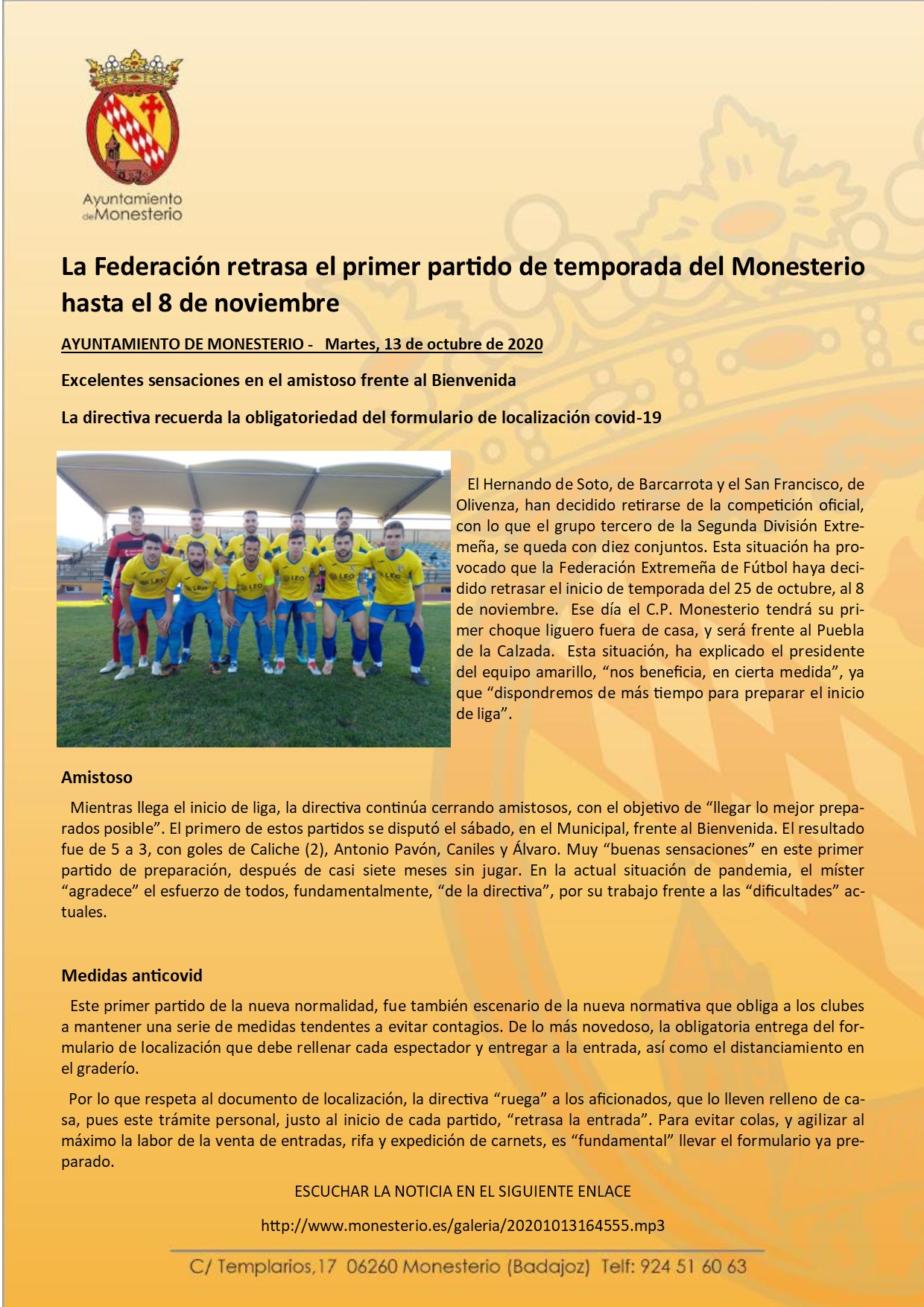 La Federación retrasa el primer partido de temporada del Monesterio hasta el 8 de noviembre