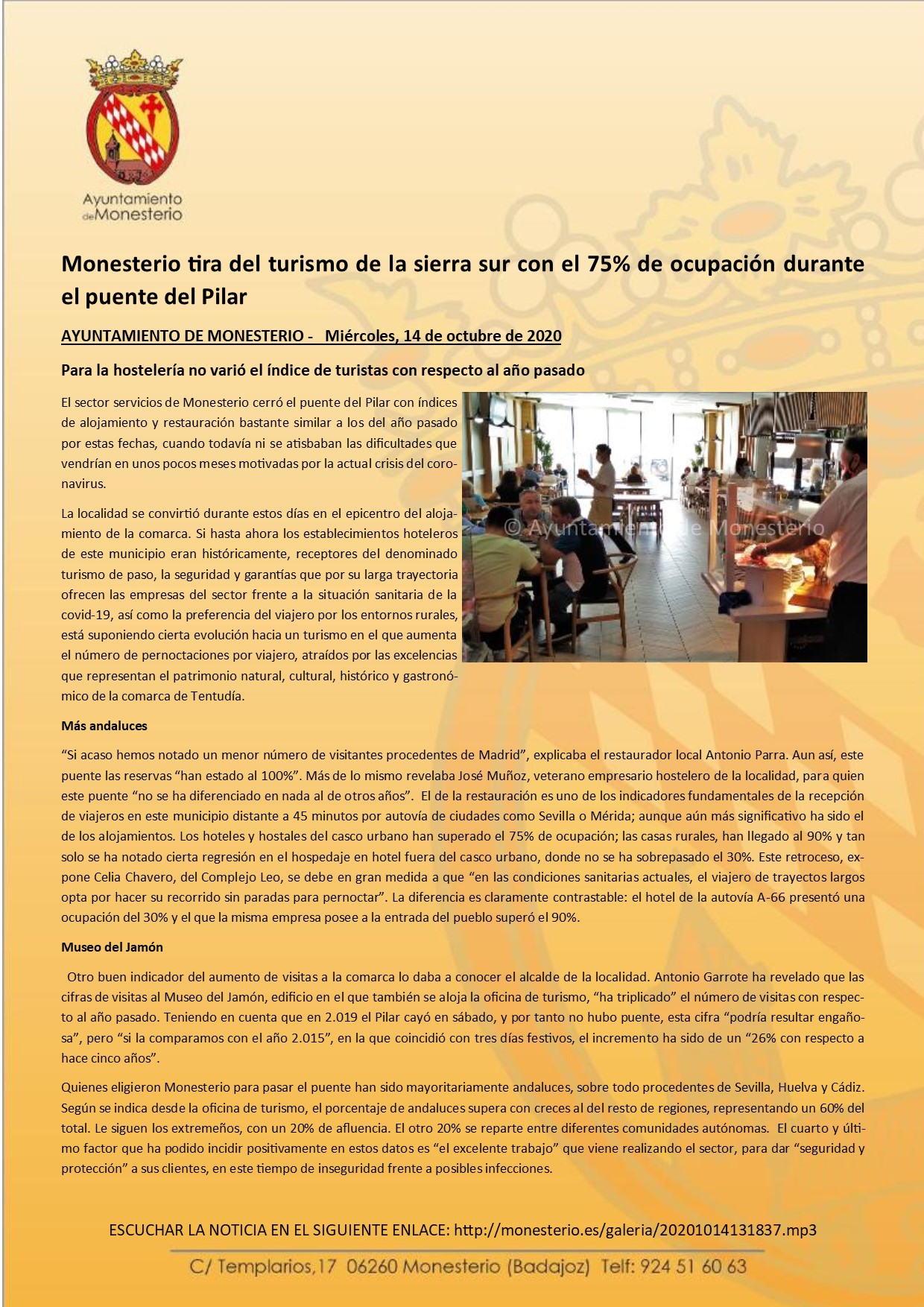 Monesterio tira del turismo de la sierra sur con el 75% de ocupación durante el puente del Pilar