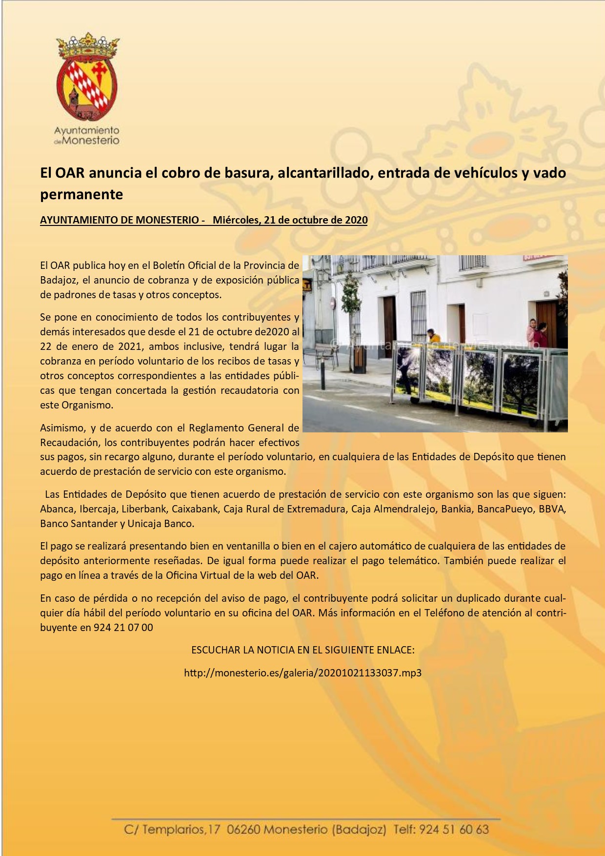 El OAR anuncia el cobro de basura, alcantarillado, entrada de vehículos y vado permanente