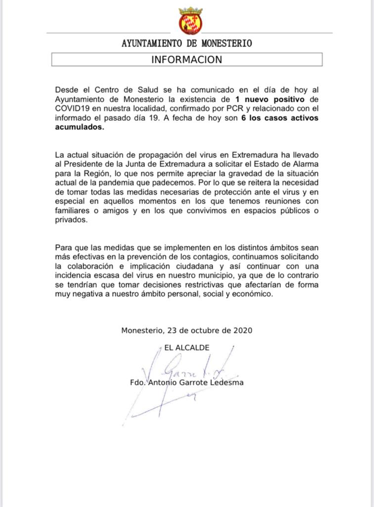 INFORMACION CASOS ACTIVOS DE COVID19 EN MONESTERIO