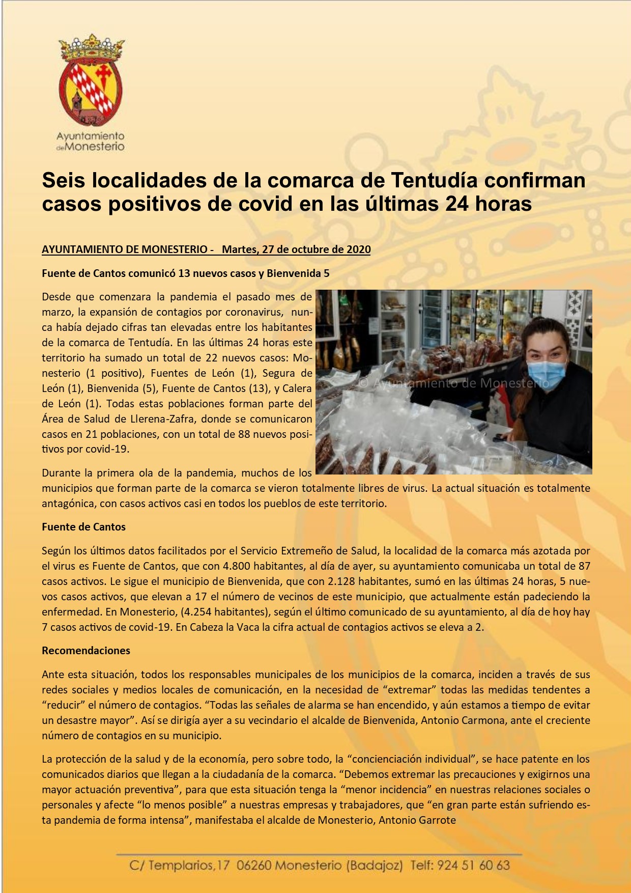 Fuente de Cantos comunicó 13 nuevos casos y Bienvenida 5