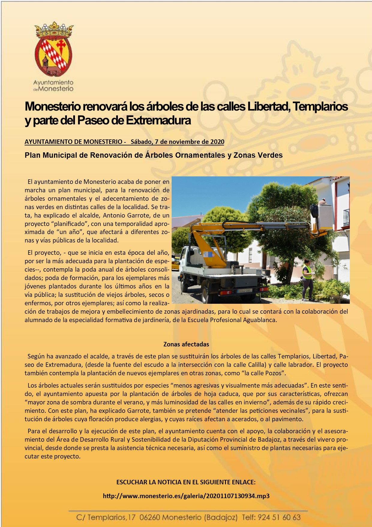 Monesterio renovará los árboles de las calles Libertad, Templarios y parte del Paseo de Extremadura
