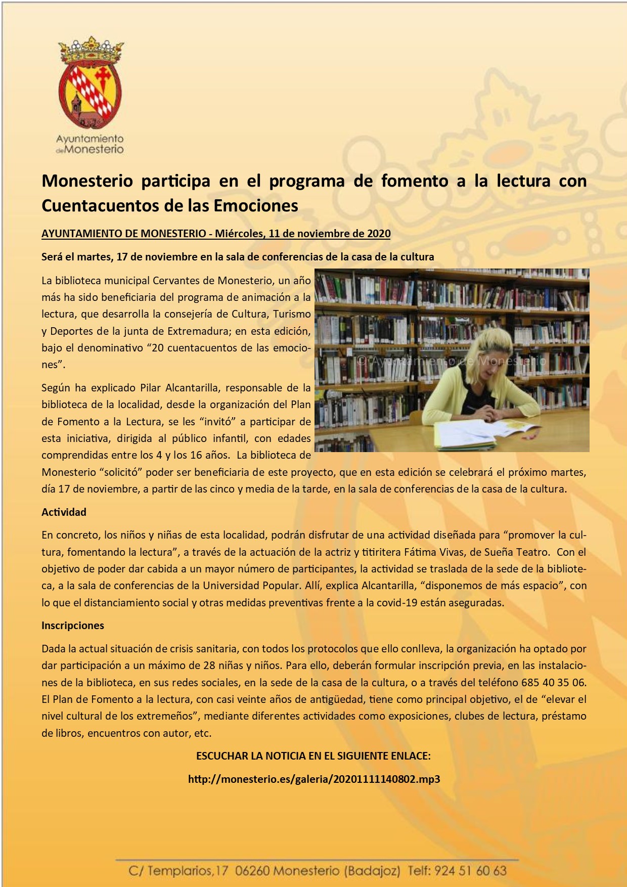 Monesterio participa en el programa de fomento a la lectura con Cuentacuentos de las Emociones