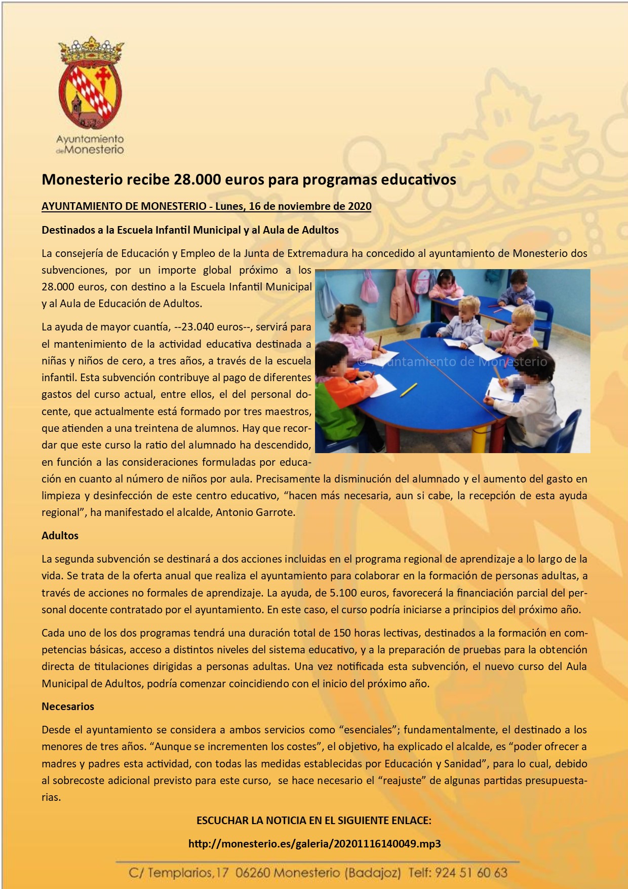 Monesterio recibe 28.000 euros para programas educativos