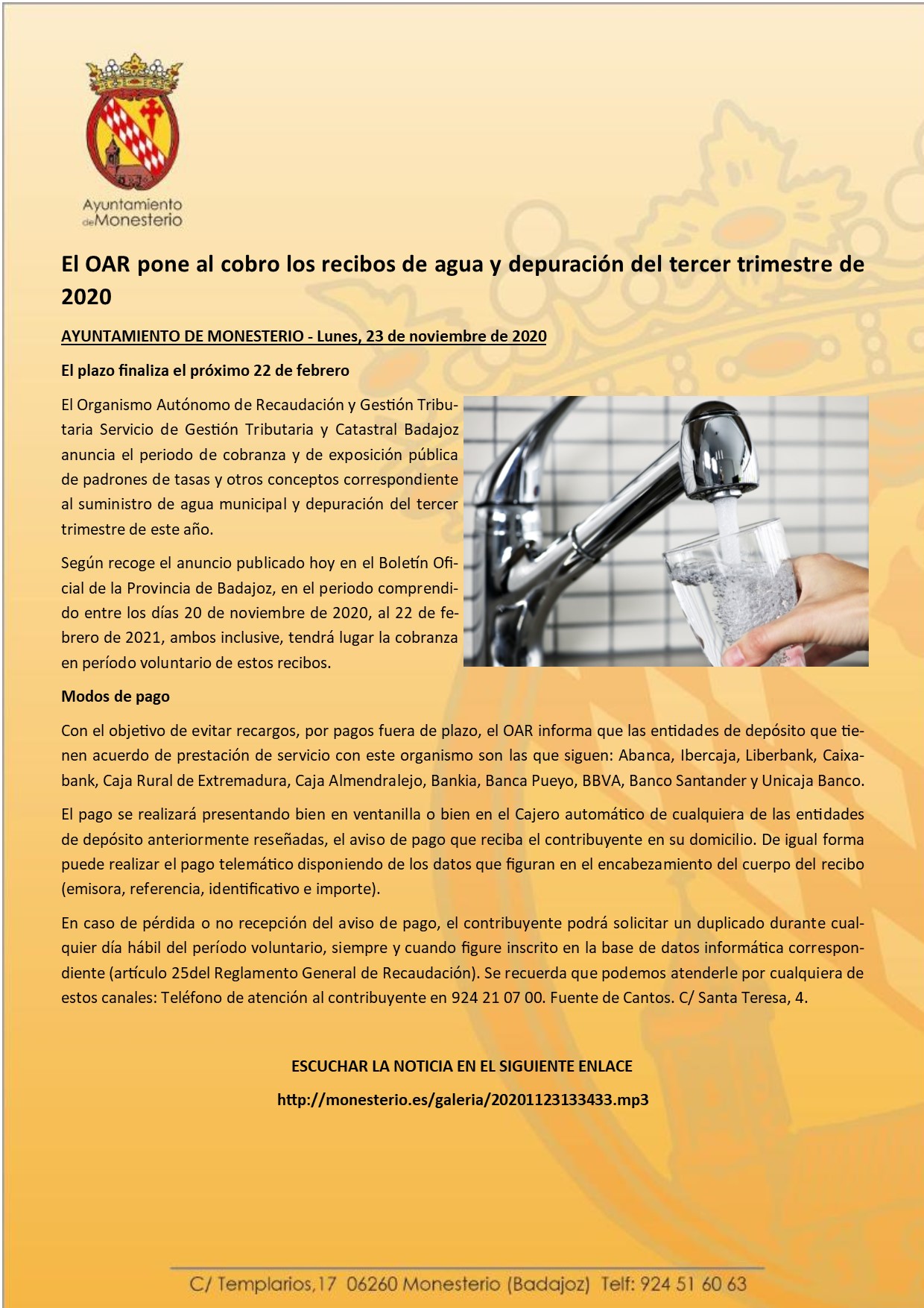 El OAR pone al cobro los recibos de agua y depuración del tercer trimestre de 2020