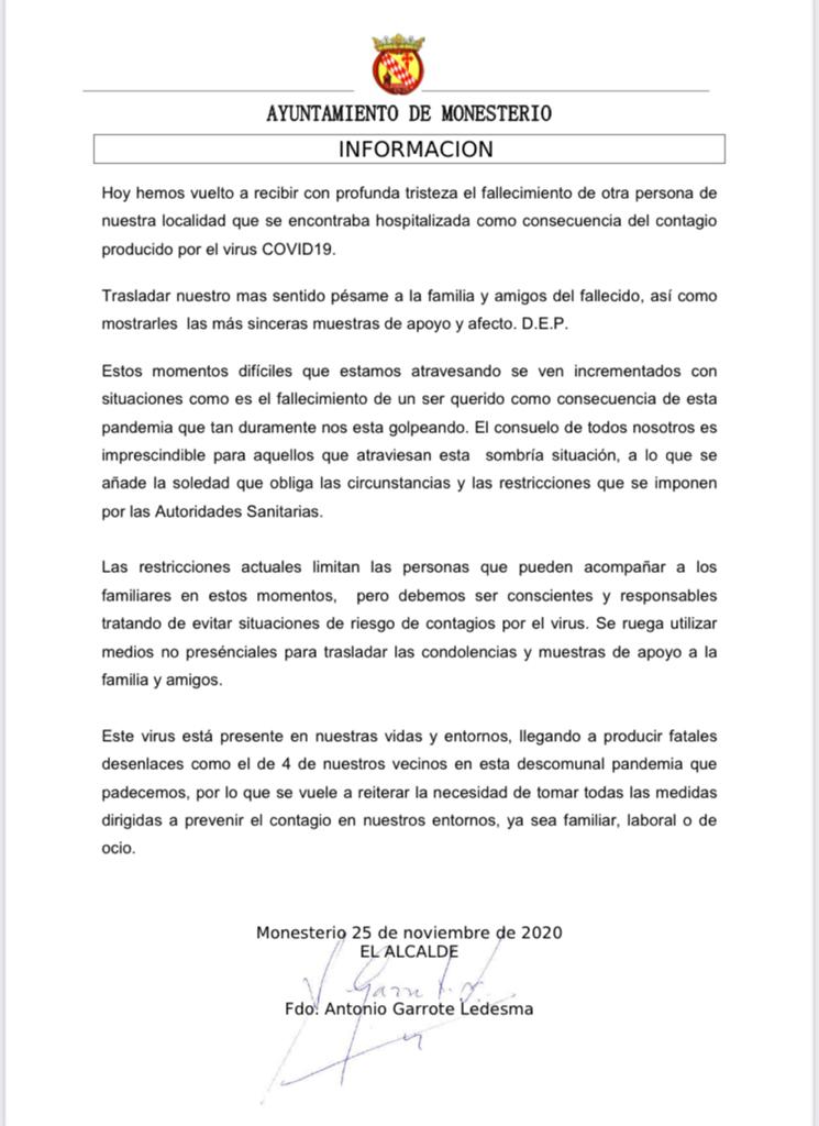 Comunicado sobre el fallecimiento de una persona de la localidad por el contagio de la COVID-19
