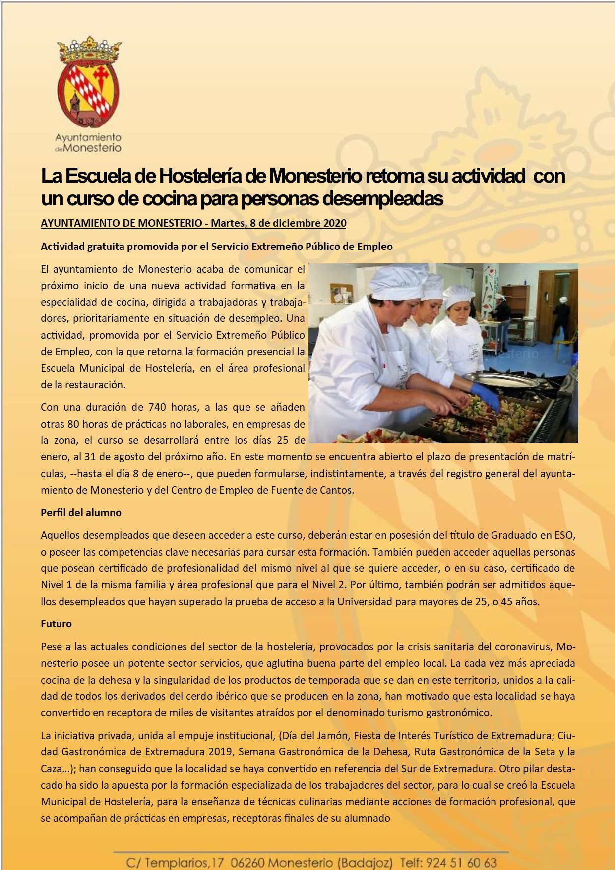 La Escuela de Hostelería de Monesterio retoma su actividad con un curso de cocina para personas desempleadas