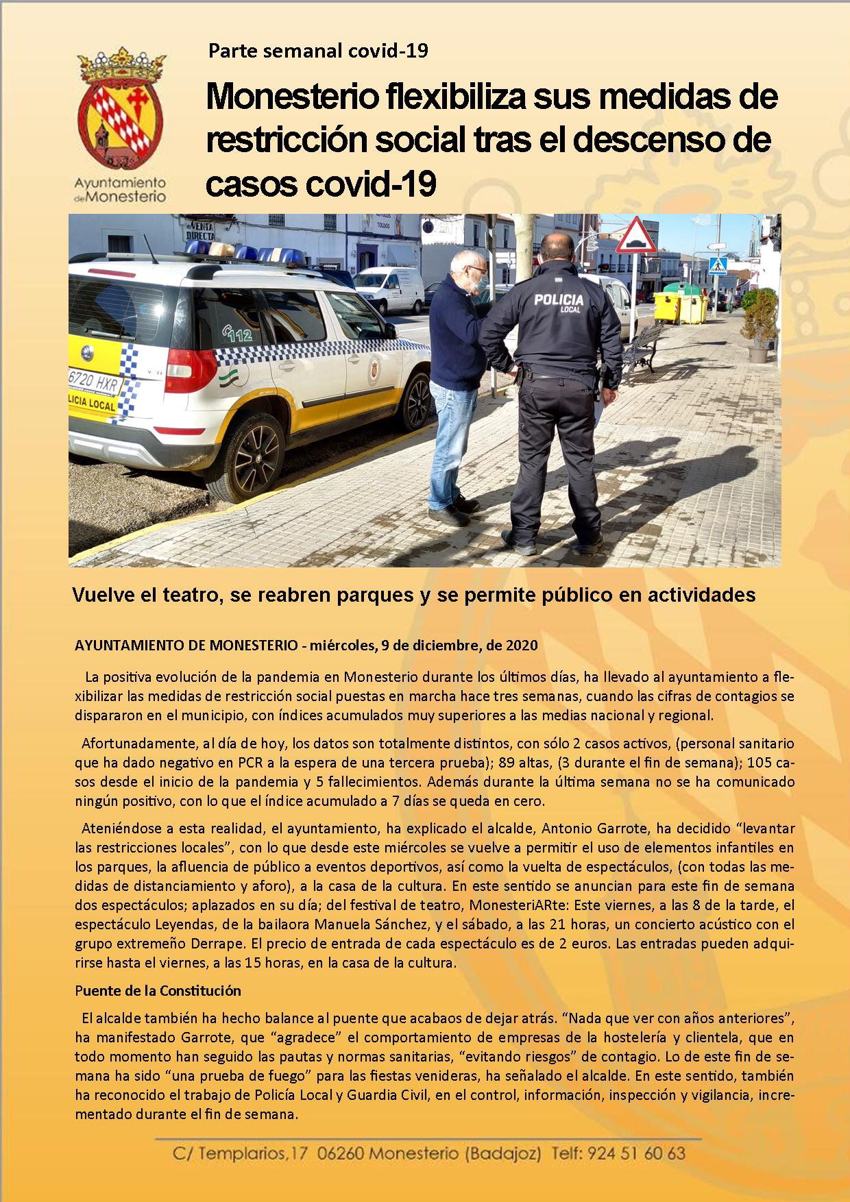 Parte semanal.covid-19: Monesterio flexibiliza sus medidas de restricción social tras el descenso de casos de coronavirus