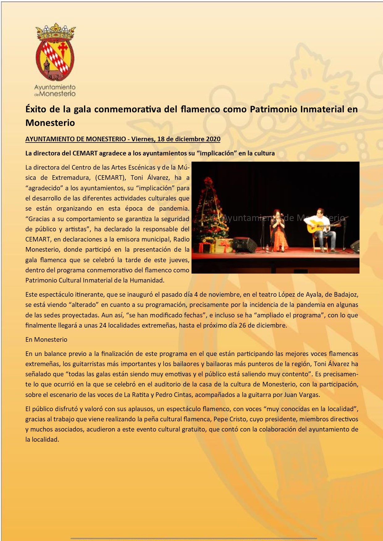 Éxito de la gala conmemorativa del flamenco como Patrimonio Inmaterial en Monesterio