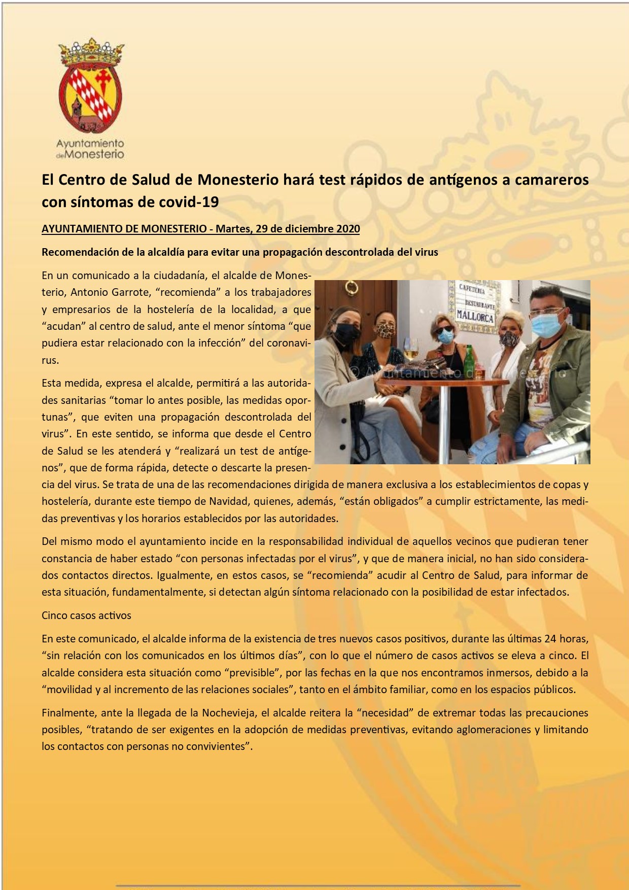 El Centro de Salud de Monesterio hará test rápidos de antígenos a camareros con síntomas de covid-19