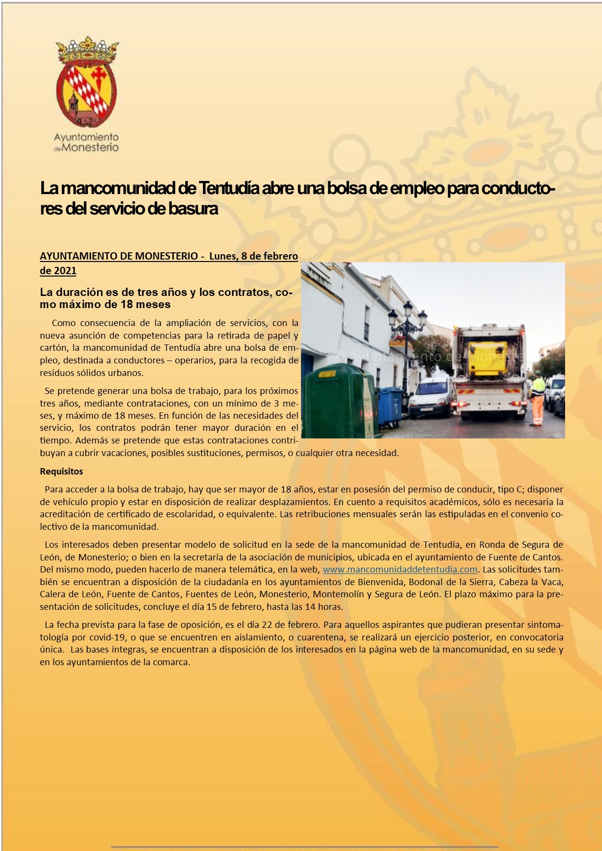 La mancomunidad de Tentudía abre una bolsa de empleo para conductores del servicio de basura