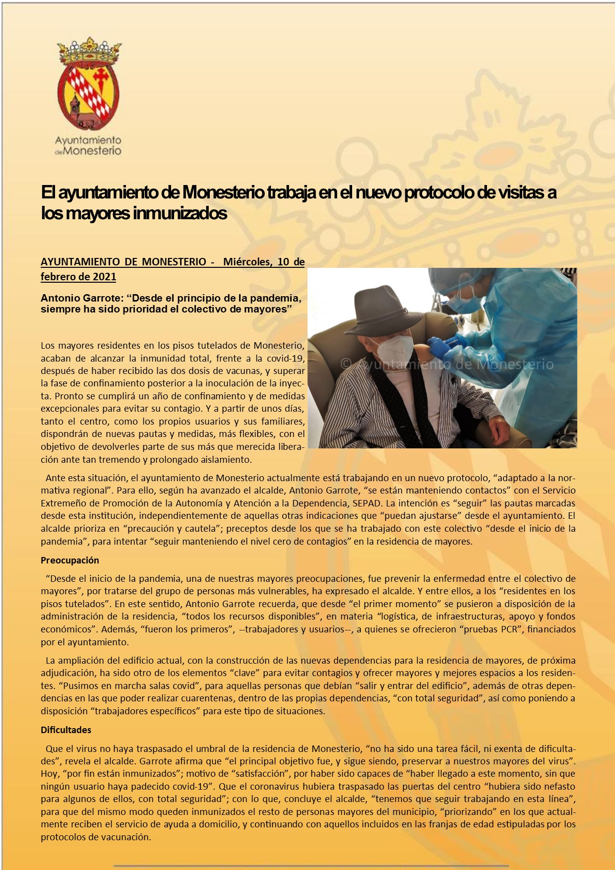 El ayuntamiento de Monesterio trabaja en el nuevo protocolo de visitas a los mayores inmunizados