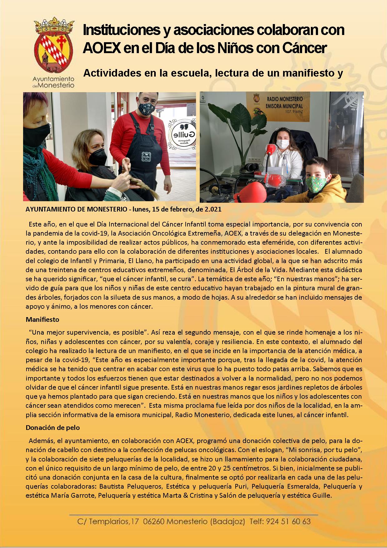 Instituciones y asociaciones de Monesterio colaboran con AOEX en el Día de los Niños con Cáncer