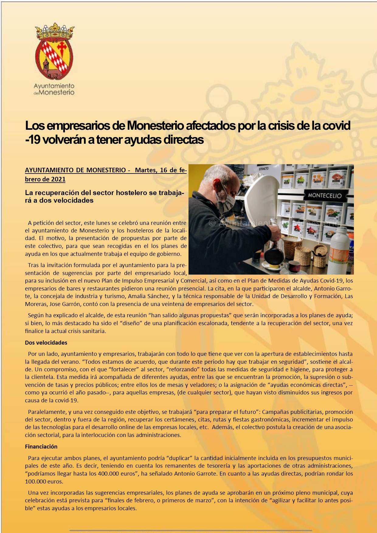 Los empresarios de Monesterio afectados por la crisis de la covid-19 volverán a tener ayudas directas