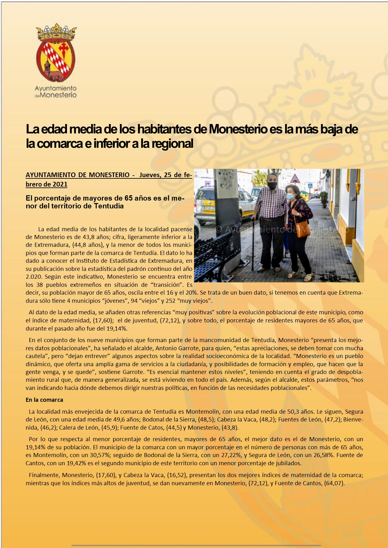 La edad media de los habitantes de Monesterio es la más baja de la comarca e inferior a la regional