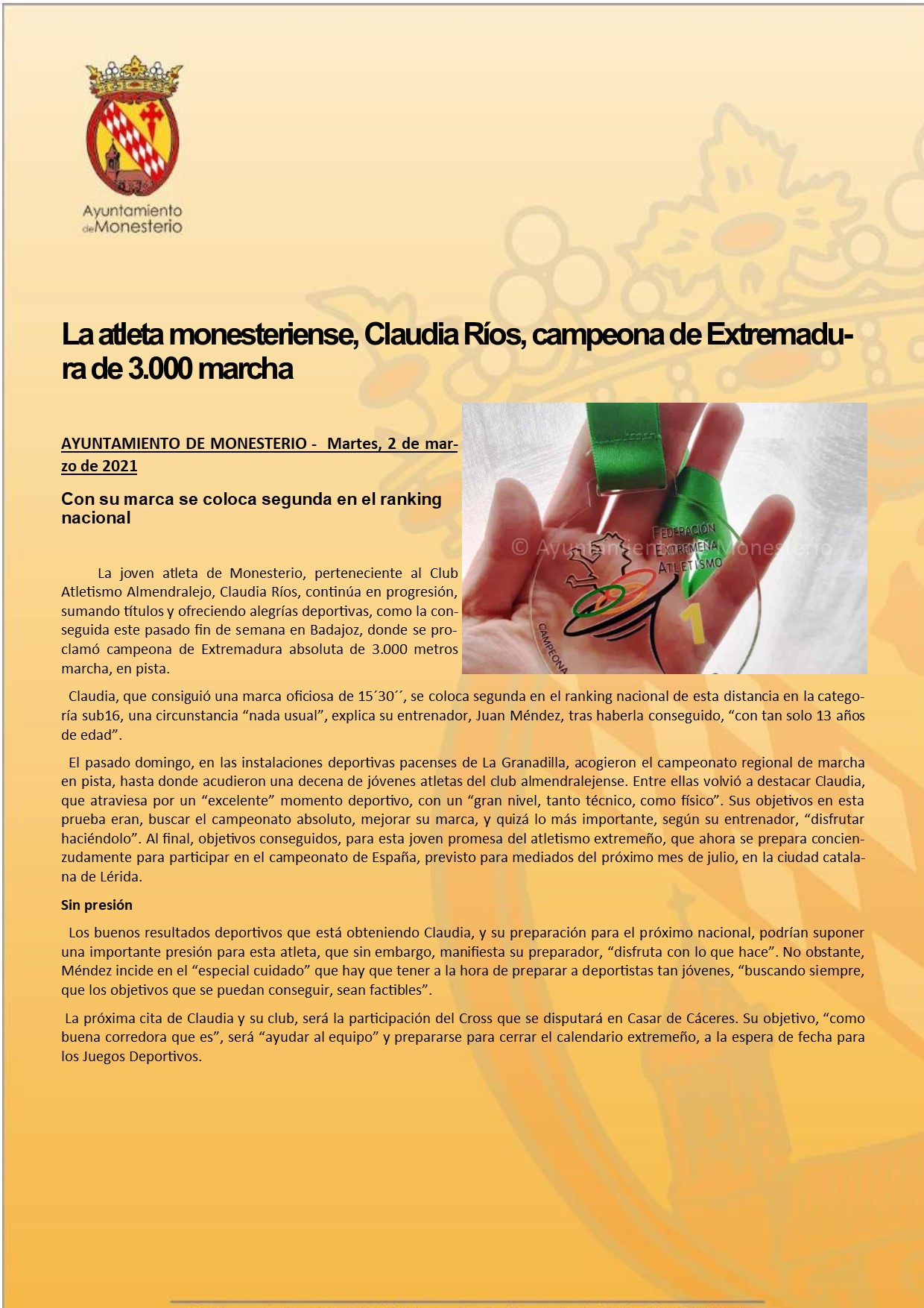 La atleta monesteriense, Claudia Ríos, campeona de Extremadura de 3.000 marcha
