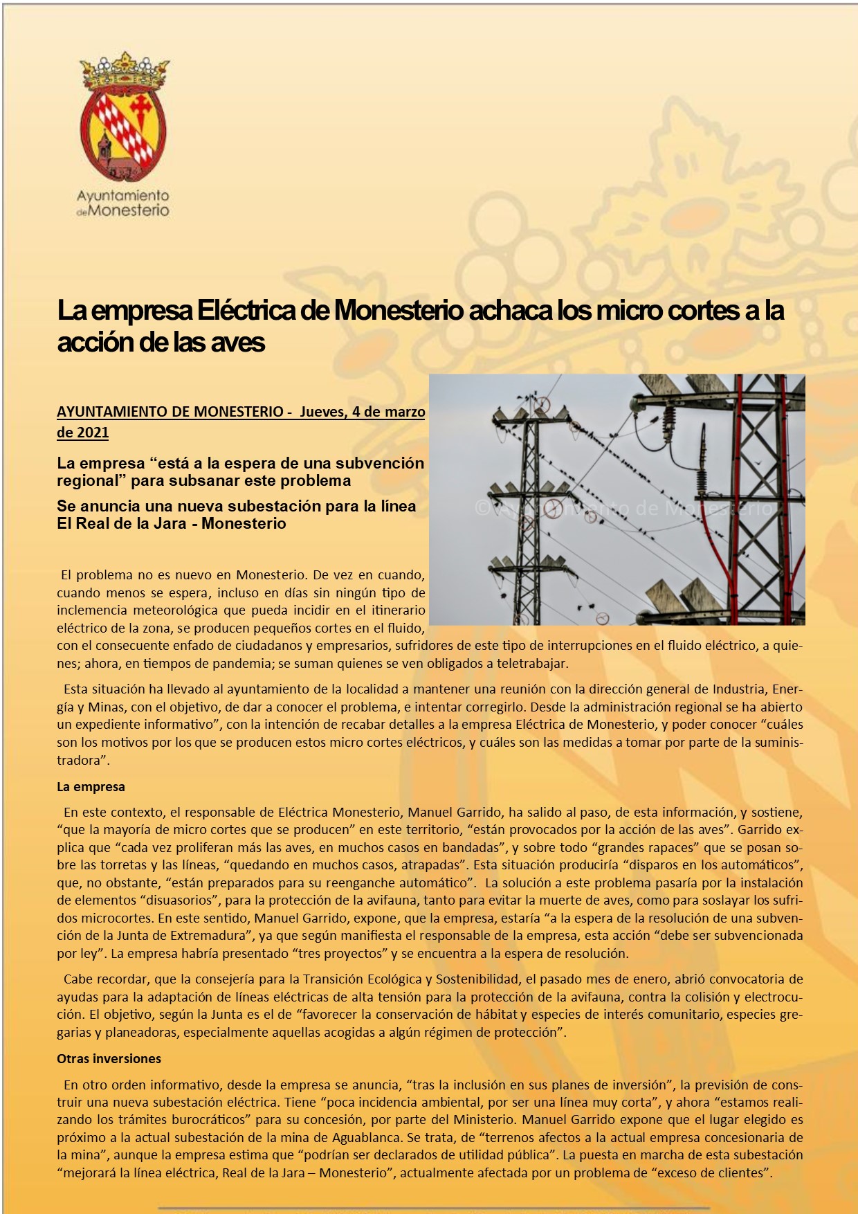 La empresa Eléctrica de Monesterio achaca los micro cortes a la acción de las aves